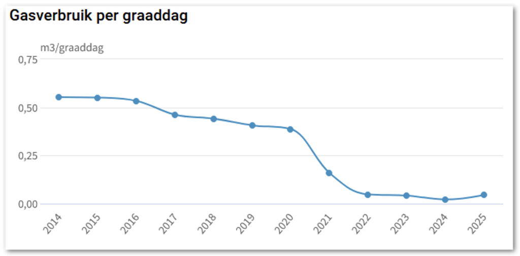 De warmtepomp draait nu geruime tijd. De belangrijkste vraag is natuurlijk: bespaar je gas? Het antwoord is: ja, je bespaart zeker gas. In de grafiek hieronder zie je het gasverbruik per graaddag. Dit is een methode om je gasverbruik te zien in verhouding tot de buitentemperatuur. Zie het als een correctie voor een koude of minder koude winter.